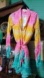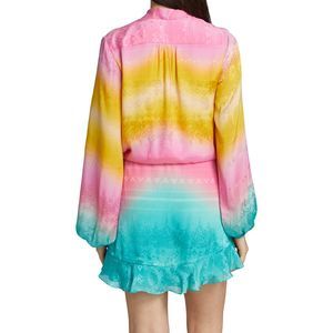 Vibrant mini dress with a tie-dye effect. Features long sleeves and a tie waist. Perfect for a bold look.