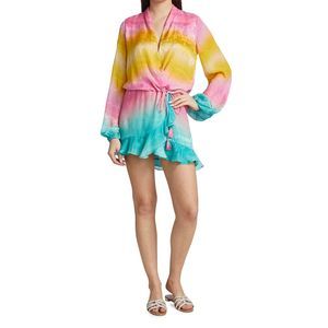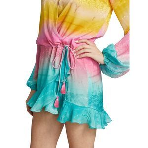 Designed with pretty tie-dye ombré coloring, this mini dress is cut with a flattering wrap silhouette and ruffle trim.