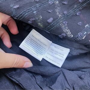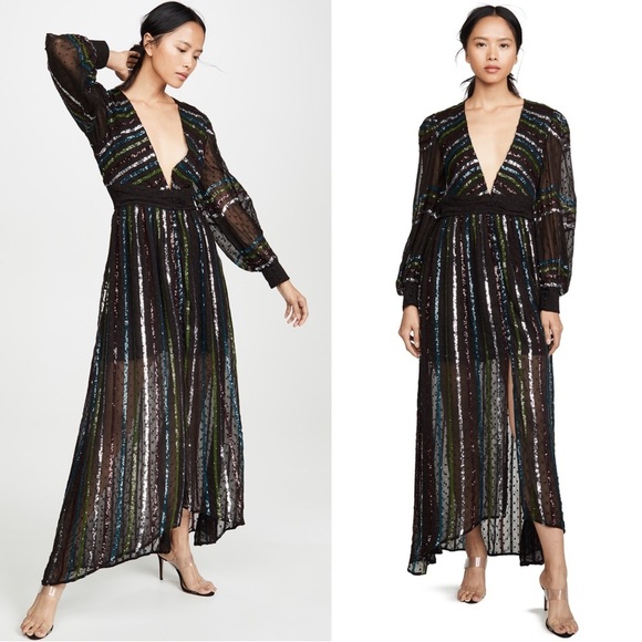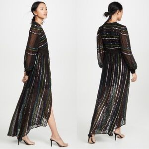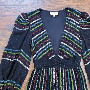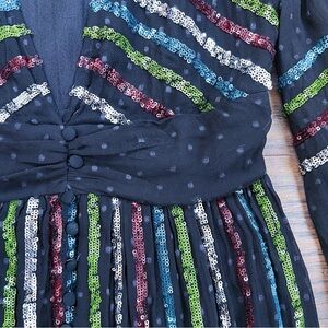 Gorgeous full length gown by designer Rococo Sand. “Sequin Striped Gown” style in black chiffon, ft swiss dot accents at waist and cuffs and rainbow striped sequin detailing. Plunging v-neck, fitted waist, full balloon sleeves, high-low hemline, lined to mid thigh. Bust 31-33“, waist 25-26“, front length 49.5“ / back length 58“. Size XS, excellent preowned condition.