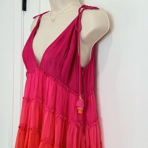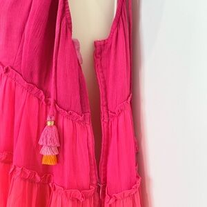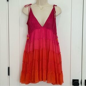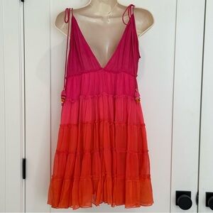 Rococo Sand Skye Mini Dress Tiered V Neck Tassels Pink Orange Large Beachy Boho