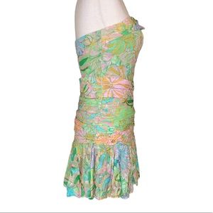 Vibrant strapless dress by Rococo Sand. Features a colorful floral pattern. Includes a stylish belt accent.