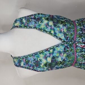 Rococo Sand Teal Boho Back To Greece Racerback Tank Mini Dress, size small. Buttons down the front. Pre-owned in excellent condition with no flaws found.