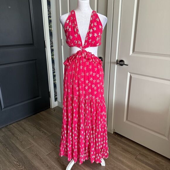 This dress is absolutely stunning! Perfect for a warm weather vacation, destination wedding, girls trip and so much more. By Rococo Sand, the Vega dress features a plunge bralette-style top with cutouts at the waist, full a-line skirt with center slit, open back with tie, fully lined and slip on style. Georgette fabric is silky to the touch in a rich shade of hot pink with metallic silver stars throughout. Great condition and a retail price of $546!
