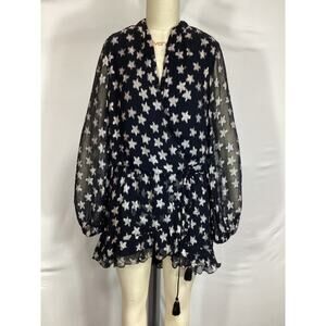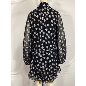 Rococo Sand 'Vega' Short Dress Size S: fabric lightweight, non-stretch georgette, flocked metallic star pattern, faux wrap design with drawstring tassel tie at waist, surplice neckline with snap closure, blouson bodice and long sleeves with elastic cuffs, flounce hem.