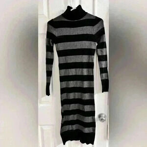 Rocorose brand gray and black striped sweater dress with turtleneck. Bodycon, Midi length with sleeves. Super stretchy knit material. Pit to pit 13” not stretched. Material 70% Viscose,30% Chignon.