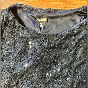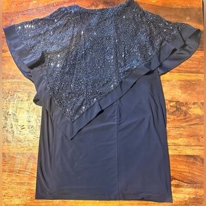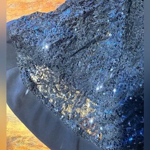 Beautiful Roxy & Ali dress. Great for any special occasion! Navy blue. Attached flows sparkling cover up with built in slip underneath!