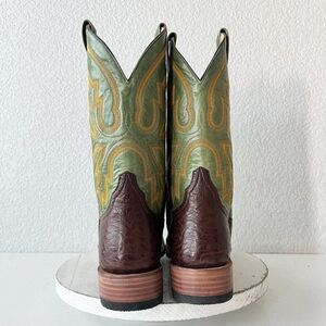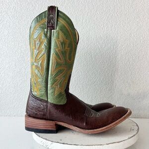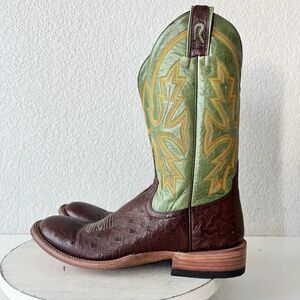 Rod Patrick Custom Bootmakers - Brown Smooth Ostrich Leather Mens Cowboy Boots with a Round Toe and Green 11" Shaft.