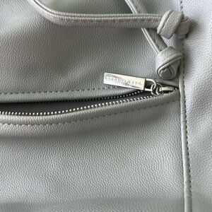 Exclusive R+F work backpack/cinch bag. Beautiful Light Grey color with silver accents and super cute! Laptop/Tablet compartment, inside zipper pocket, outer zipper pocket with R+F embossed zipper pull, cinch top, with magnetic clasp. Adjustable straps with silver webbing details. Faux leather exterior, cotton interior.