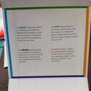 Mini mask set by Rodan + Fields. Includes Rejuvenation, Radiance, Rescue, and Clarifying masks. Perfect for skincare routine.