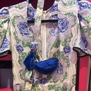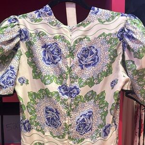 Elegant maxi dress with blue and green floral pattern. Features puff sleeves and a deep neckline. Perfect for special occasions.