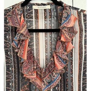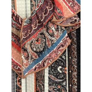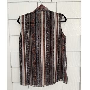 Elegant and artistic, this Rodarte sleeveless top features a lightweight chiffon texture with a bold paisley and stripe print. The attached scarf neckline adds designer flair and can be styled multiple ways—tied, draped, or wrapped. A versatile piece perfect for layering or statement dressing.