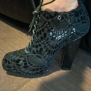 Step into runway-level style with these rare Rodarte × Opening Ceremony crochet lace-up booties. Featuring an intricate dark green crochet overlay atop glossy patent leather, these statement ankle boots showcase bold craftsmanship and the edgy sophistication both brands are known for.
