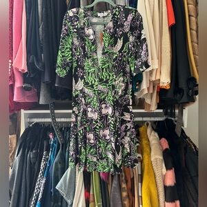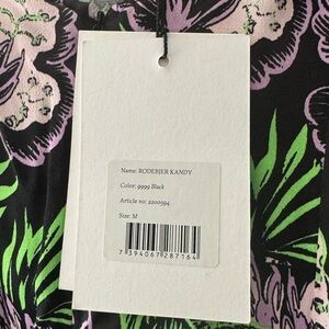 Beautiful mini dress from Rodebjer. Black, purple and green floral print with invisible zipper at center front- looks great left open or zipped up. Skater style Skirt. Great quality, never worn with tags