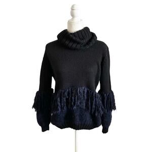 tags: sweater, knit, pullover, turtleneck, chunky, textured, fringe, black, navy, longSleeve, cozy, warm, stylish, chic, modern, trendy, casual, fall, winter, soft, statement, unique