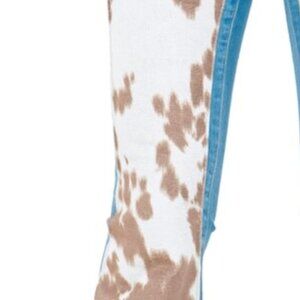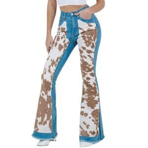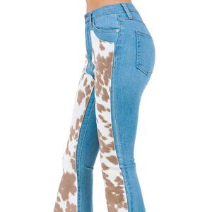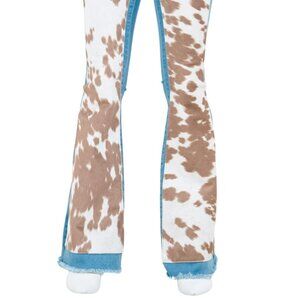 Ride into style with our Rodeo Bell Bottom Jean! These Western-inspired jeans elevate any outfit with front faux cow hide inserts and a flattering 34" inseam length. Made in the USA with stretch denim, they're as comfortable as they are stylish. Moo-ve over, basic jeans! This unique style is a one of a kind.