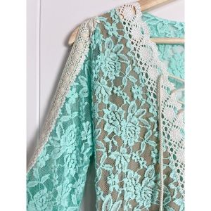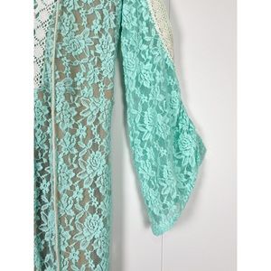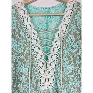 Mint Lulu Belle Dress by Rodeo Fox. Find feminine appeal in this crochet-detail maxi dress that boasts lace-up features and upper arm cutouts for added flair. Lined. Size S/M. New with tags. Only tried on. Minor hole on front near slit. Scroll up and see all photos again, please.