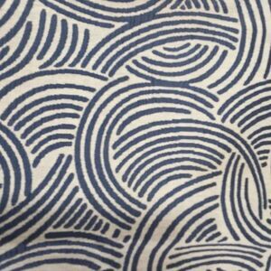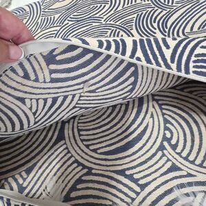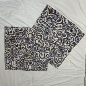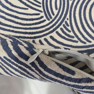 These throw pillow covers have a modern, abstract pattern in navy blue on a cream background. The design is made up of overlapping curved lines and arches that create a swirling, wave-like effect, giving them a bold and contemporary look. The fabric is a premium quality medium-weight woven cotton blend material, making them both decorative and durable. Their neutral base with dark blue accents allows them to pair well with a variety of color schemes, adding texture and style to a sofa, chair, or bed. There is one very faint spot as shown in picture - these have only been air dried after washing so new owner may have success removing the spot though it really is not noticeable.