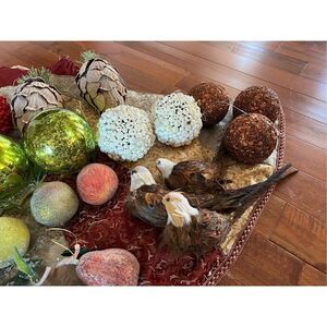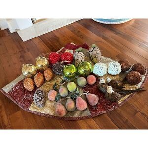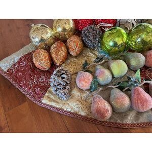 Excellent condition tree skirt used a couple times. Size 54” diameter 100% polyester, beautiful gold and red material. 30 Boutique ornaments- 2 gold balls, 2 green balls, 3 brown sequin balls, 2 red Berry balls, 2 white berry balls, 1 pine cone ball, 2 fabric style pine cones, 1 line cone covered in ice glue, 9 frosted pears, 3 partridges missing some feathers and eyes.