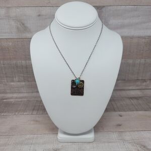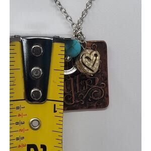 Rodeo Queen necklace by Angelz Design with copper pendant that says HECK YES and three charms - a horseshoe, a heart and a turquoise bead. Silvertone chain with lobster claw clasp measures approximately 17 inches with an extender to allow up to 20 inches. In good preowned condition.