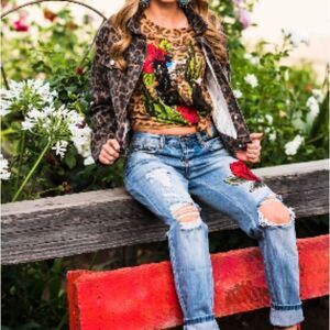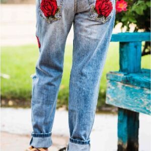 Introducing the Ella-Rose Denim Pant. These stylish jeans feature a unique denim rose design with strategically placed holes for a trendy, yet edgy look.