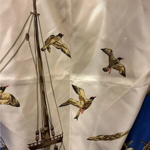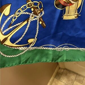 Elegant silk scarf featuring a nautical print. Vibrant blue and green colors with intricate designs. No rips, holes or pulls. EUC! Measures 34” X 34”.