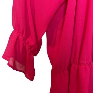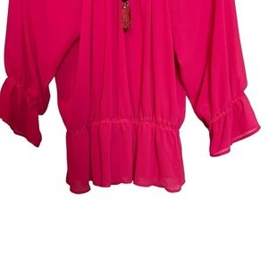 This Rods Western Wear Sassafras Chiffon Fuchsia semi sheer top has an embroidered neckline with beaded tassels with tie closure. It has an elastic peplum style waist and a elastic cuff with a ruffle hem. This is a stunning top that is so feminine. Size Medium measurements are flat laid PTP 18 1/2” length 24 1/2” sleeve 21 1.2” 😊