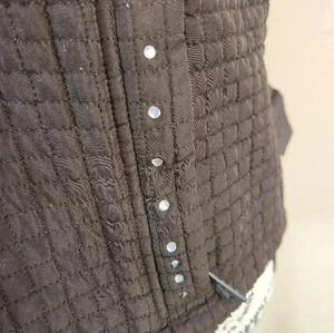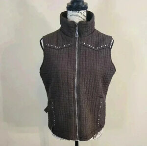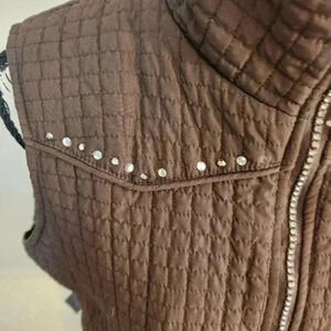 This stylish quilted vest in brown features a zip front and sparkly detail's, making it perfect for layering on chilly days. This vest is in good pre-owned condition, but it is missing some of the bling, which could easily be replaced with a quick trip to the craft store. The perfect fall/winter vest for the cowgirl in you.