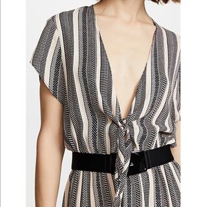 Super cute mini dress from brand Roe + May. Style is called the Saz Mini Dress. Low cut and has a tie front. It’s a nude color with black stripe and dot print. Purchased from Shopbop. Brand new with tags, size Large. It’s pictured with a black belt in the stock photos, but just has an elasticize waist as shown in the side view photo.