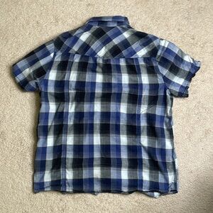 This casual button down shirt features a striking blue and black plaid pattern, perfect for everyday wear. Its short sleeves and comfortable fit make it an ideal choice for relaxed outings.