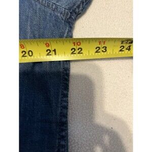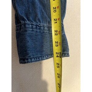 The Roebuck & Co Denim Shirt is a vintage-inspired men's western pearl snap shirt in size Large. Made from lightweight cotton denim fabric in a classic solid blue color, this button-up shirt features pearl snaps, a collared neckline, and a regular fit. With a chest size of 44 inches and a point collar style, this shirt is suitable for all seasons and can be styled in a western, cowboy, or classic vintage look. Machine washable and perfect for casual wear, this shirt is a timeless addition to any wardrobe.