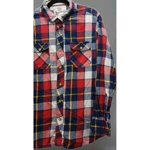 Classic mens Large flannel from Roebuck & Co in a bold red/blue/navy/yellow plaid that hits just right. 100% cotton and ready for layering. Front snap-style button closure, dual chest flap pockets, and rugged outdoor feel.