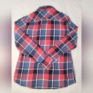 This casual button down shirt features a vibrant red and blue plaid pattern, perfect for a relaxed look. Made from soft, comfortable fabric, it's ideal for cooler weather. Its timeless design ensures it remains a staple in any wardrobe.