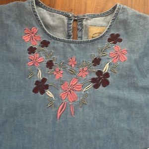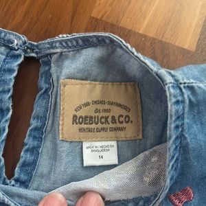 NWT Roebuck&Co. Ruffle dress Embroideri in front Msize 14 but is run smoll Color blue jeans wash