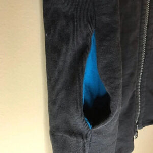 Comfortable and cozy hoodie with robbed detailing and a small bit of embroidering on the right hand cuff. This is made of nice thick fabric and features dual zippers. The color contrast hood is very cool.