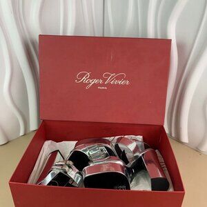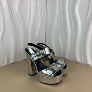 The Roger Vivier platform heels combine a bold metallic design with an elegant block heel, offering style and comfort for elevated occasions.