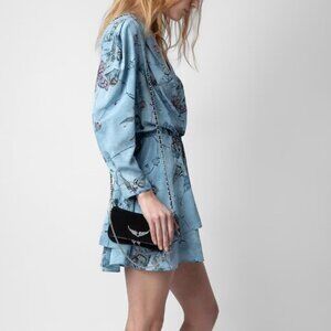 Blue silk mini dress with print, elasticated waist and asymmetric skirt.