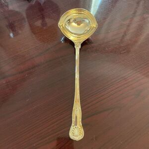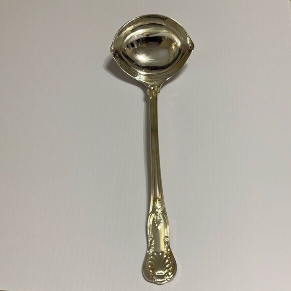 Vintage Rogers Silverplate Serving Ladle. Hook for resting in pot. Intricate design. Some spots need buffing, due to age and use. Lovely. 13”.