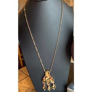 Roget Gold plate Necklace with a Work of Art pendant of Brushed Gold and faux Turquoise domes and faceted Rhinestones