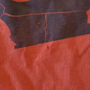 This shirt is in good condition. It does have a couple of small holes and with a small bleach mark at the bottom. There are also a couple of black marks on the shirt but has a ton of life left i. it.