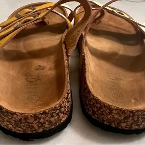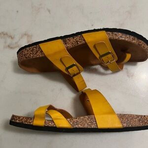 Bright yellow strappy sandals with adjustable buckles. Comfortable and stylish for casual wear.