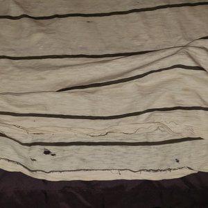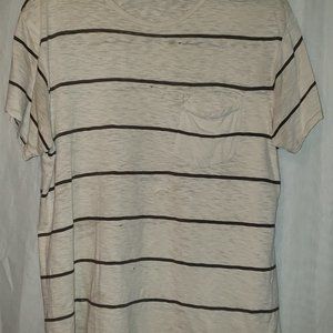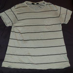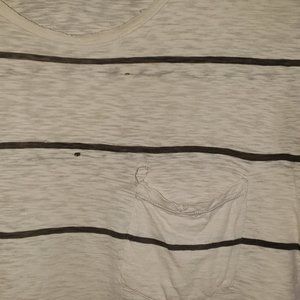 extremely soft, thread bare, pre-distressed striped pocket t-shirt, various small holes