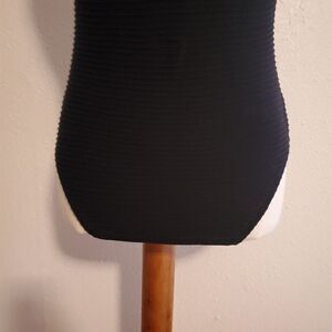 Classic black one piece swimsuit with front golden metallic brand tag accent. Open back. Pre-owned in good condition ( minor inside croch flaw as pictured). Size is missing. Best guess it's a size L. Please refer to pictures and measurements for best description and fit.