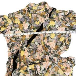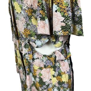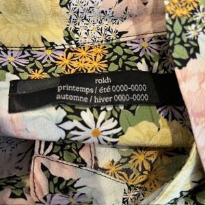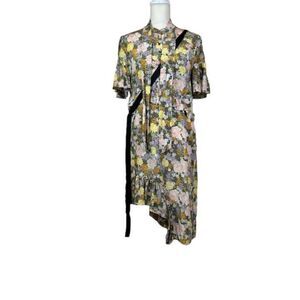 Rokh Silk Split Floral Frill Dress Ruffle Strap Pink Yellow Blue Women's Size 10. Excellent condition.Multicolored floral printed silk (100% Silk). Hourglass. Short sleeves. Shirt collar neckline. Hidden side zipper closure. Very unusual design. Conversation piece for sure! Floral, ruffles, neck hanging sash, black strappy piece that buckles in back and side , front buttons, hem ruffle separates part way for added flair. Side cut out. See photos for details and measurements. Shop my closet to combine and bundle other items for one shipping charge! Perfect for clubbing, graduation, vacation, wedding, spring, summer, date night, cruisewear, beach, trip, boho,