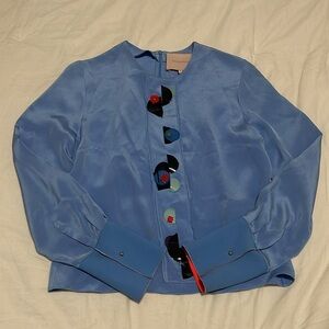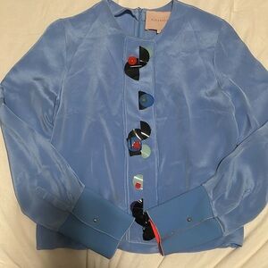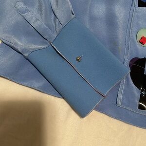 Material of your money. Graphic multicolored fancy embellishments on the front. Hidden button closure at the back. 100% silk. No lining. Made in England. Size 8 uk