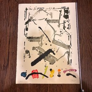 This Abstract Expressionist color lithograph by Roland Ginzel was printed at Four Brothers Press in Chicago. Four Brothers Press was founded by Fred Gude, who had assisted printer Jack Lemon at Landfall Press, and his partner Leslie Wolfe in 1980. Four Brothers Press published and printed for many major Chicago artists who came into their own in the 1980s. The press closed in 1987 with the death of Fred Gude.