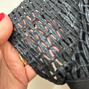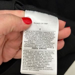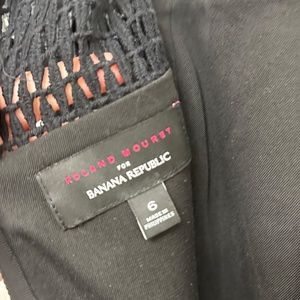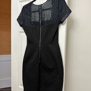 Beautiful black Roland Mouret for Banana Republic cocktail dress, midi style with black shimmery lace/crochet detail on the sleeves and back of dress. Size 6.