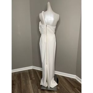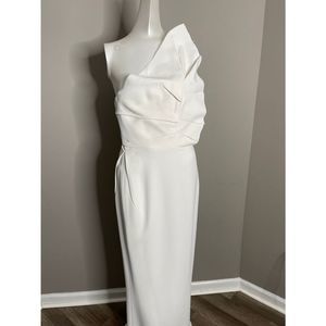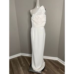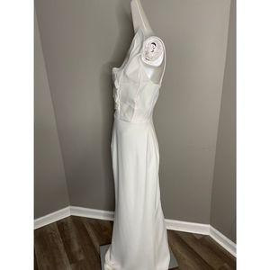 Graceful gown with an artistic bodice, one-shoulder neckline, and silhouette-skimming cut.
