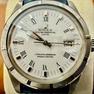 This stunning Vintage Rolex has an Acrylic crystal. Engine turned bezel on stainless steel case to crown measures 35mm wide, in excellent condition. 26-jeweled Rolex cal.1570 COSC automatic movement, cleaned & serviced, in excellent running condition. On Blue leather aftermarket bracelet, w/ aftermarket Rolex buckle, measuring 18.5cm with the watch, in excellent vintage condition.