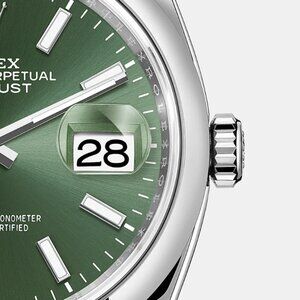 This Oyster Perpetual Datejust 36 in Oystersteel features a mint green dial and an Oyster bracelet. Mint green dial A watchmaking technique The sunray finish creates delicate light reflections on many dials in the Oyster Perpetual collection. It is obtained using masterful brushing techniques that create grooves running outwards from the centre of the dial. Light is diffused consistently along each engraving, creating a characteristic subtle glow that moves depending on the position of the wrist. Once the sunray finish has been completed, the dial colour is applied using Physical Vapour Deposition or electroplating. A light coat of varnish gives the dial its final look.
