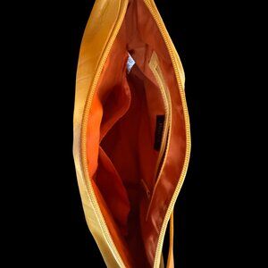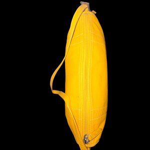 Beautiful sunshine yellow genuine leather shoulder bag with adjustable shoulder strap (23"-28"). Was part of a sample sale and only has minor use marks as seen in last two photos. Interior has 1 zipper pocket and 2 slip pockets. Measurements are 12.5" across front, 4" wide, and 8" tall. From a smoke-free home.